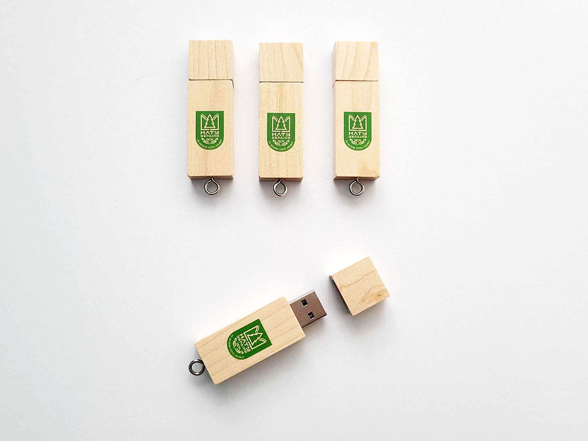 Матеріали та дизайн: пластикові, металеві з гравіюванням, шкіряні з тисненням або гравіюванням, дерев’яні еко-флешки з друком
